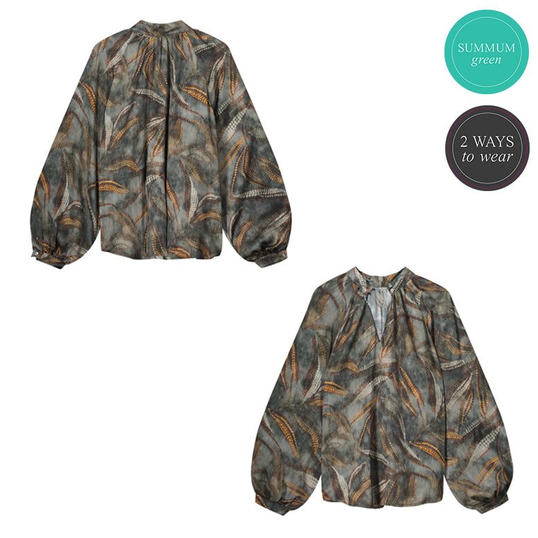 This blouse is crafted from eco-conscious viscose and features a sophisticated botanical print that feels both earthy and avant-garde. Designed with a "two-way" neckline, it allows you to transition seamlessly from a modest high-neck to an elegant V-neckline simply by reversing the garment.