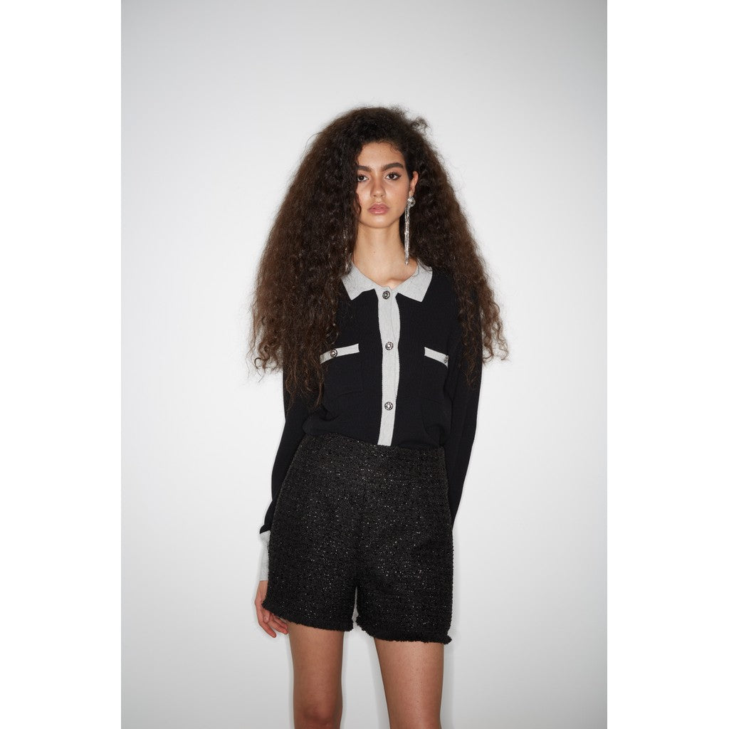 A timeless knitted cardigan with a modern twist, this black knit features soft light-grey contrast trim that highlights the collar, cuffs, and button placket. The front patch pockets add a touch of structure, while the embellished buttons elevate the look with subtle elegance.