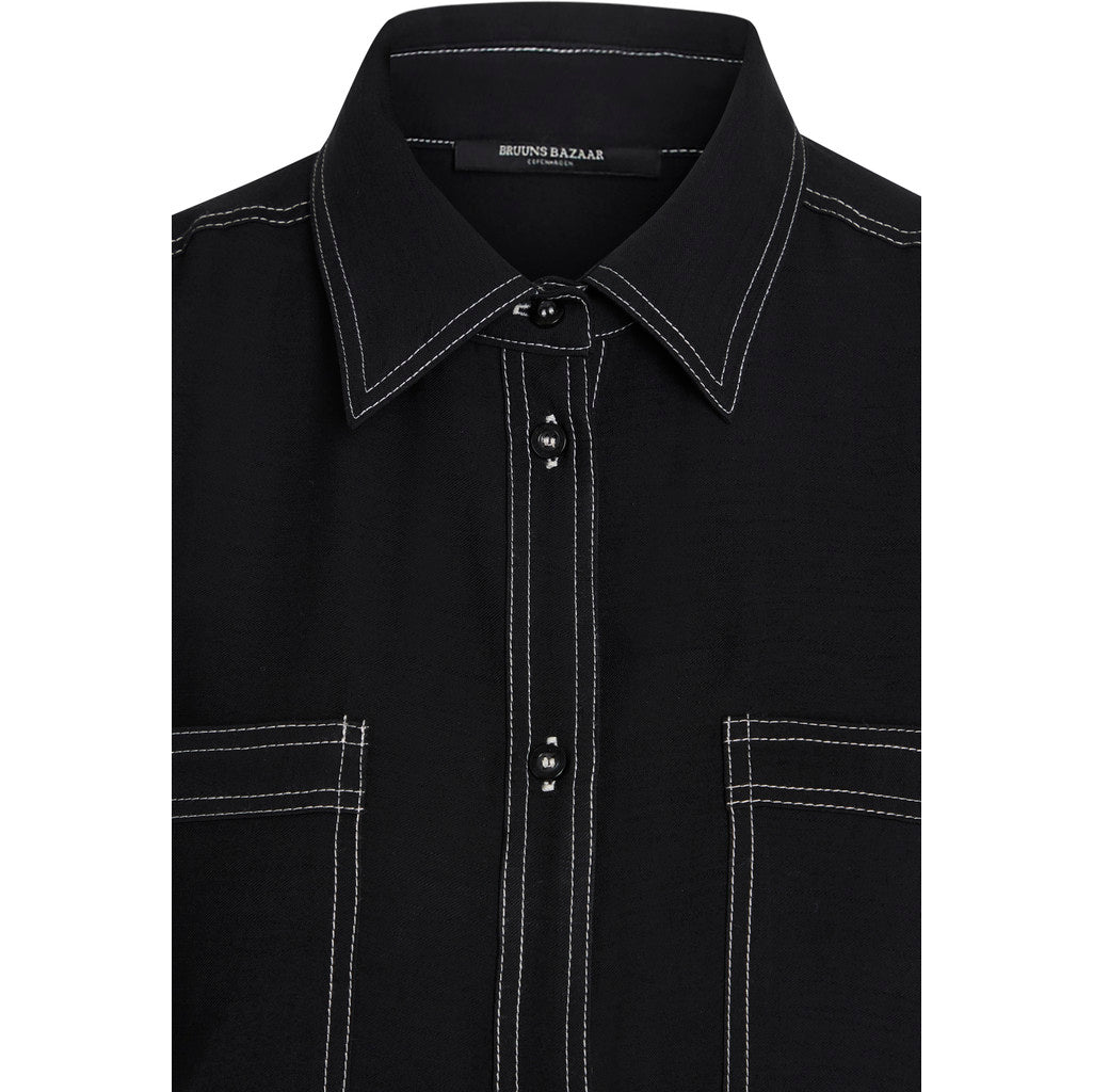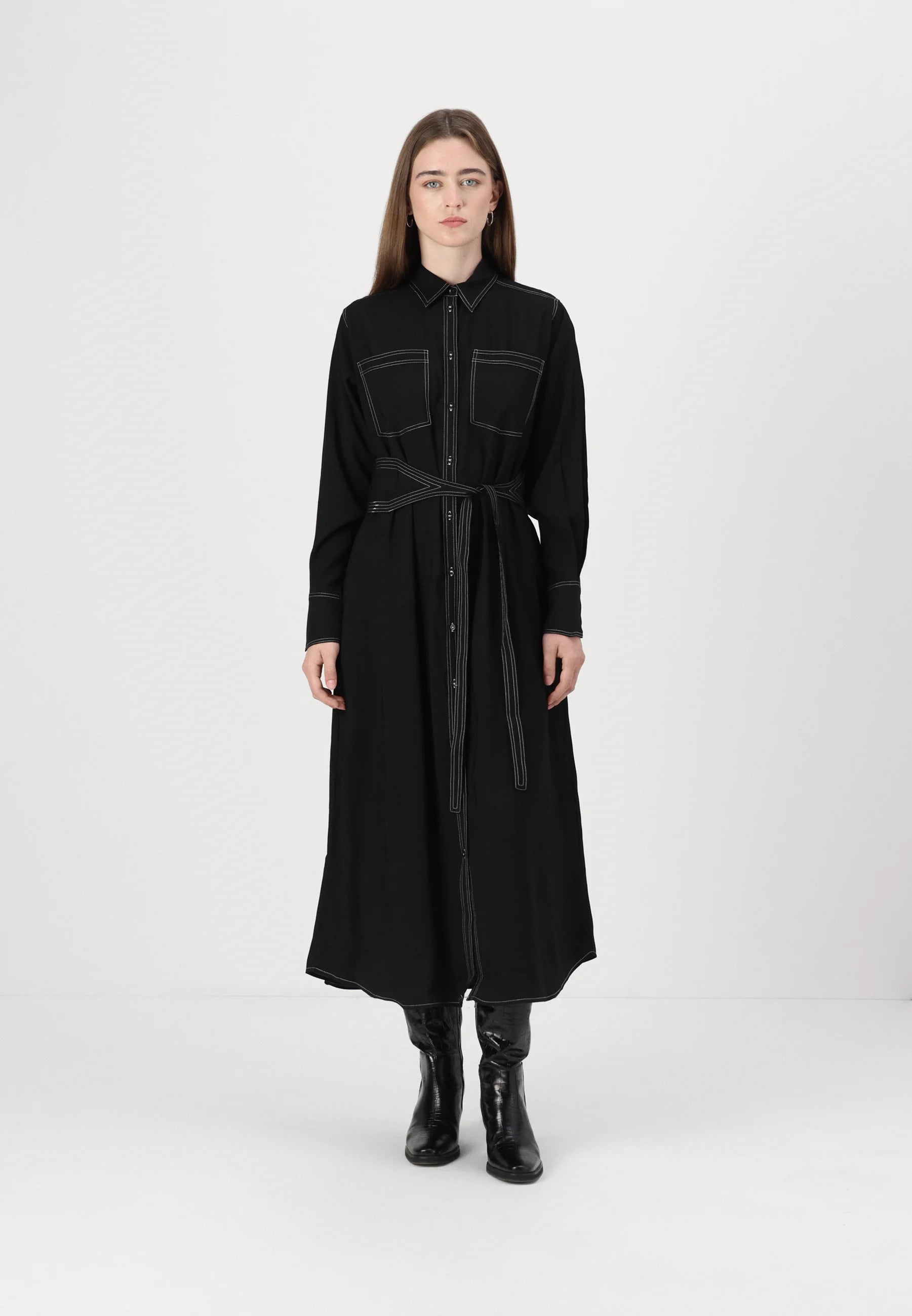 An effortlessly polished midi dress designed with clean lines and thoughtful details. Crafted in a fluid black fabric, it features contrast stitching, a button-down front, and a removable self-tie belt to define the waist. Utility-inspired chest pockets add a modern touch, while the long sleeves and relaxed silhouette make it easy to wear from day to night. A timeless staple that blends structure with ease.