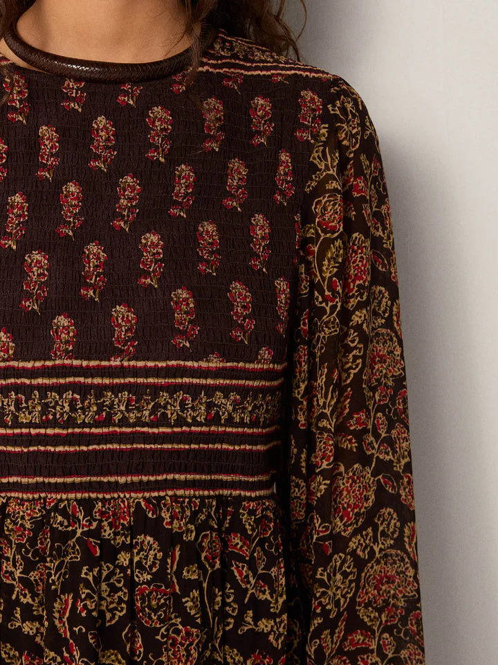 Its dark base is adorned with floral and border motifs in warm shades of red, ochre, and moss. Each tier is defined by rhythmic prints, while the smocked cuffs and round neckline add refinement.