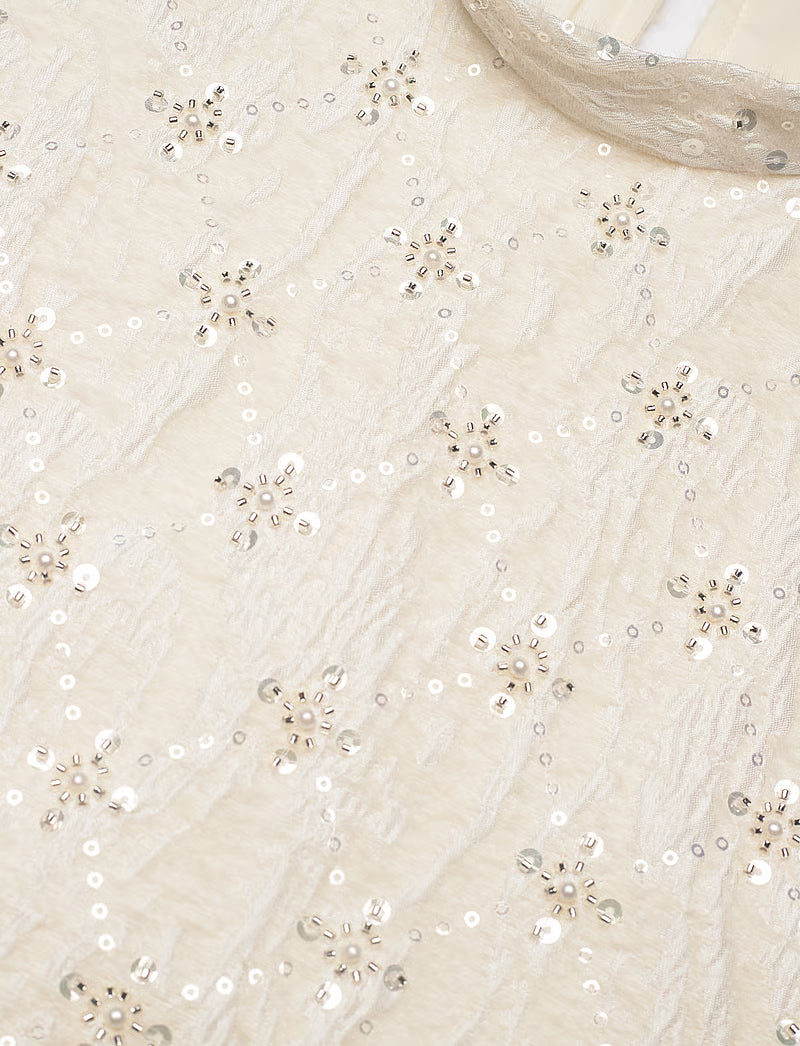 Beautiful short dress with pearls and sequins. The dress is designed in an A-line fit, has a lining inside, and features an opening at the back with two buttons.