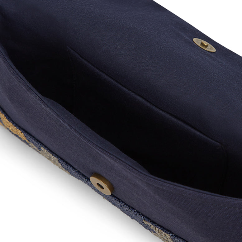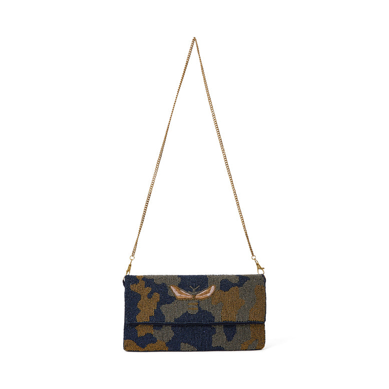This beaded clutch features a navy, bronze, and gold camo-style pattern, finished with a delicate dragonfly motif on the flap for a touch of whimsy. The slim silhouette holds just the essentials, while the fine gold chain strap lets you wear it on the shoulder or tuck the chain in and carry it as a hand-held clutch. Perfect for evenings out, holiday parties, or whenever your outfit needs a subtle bit of sparkle.