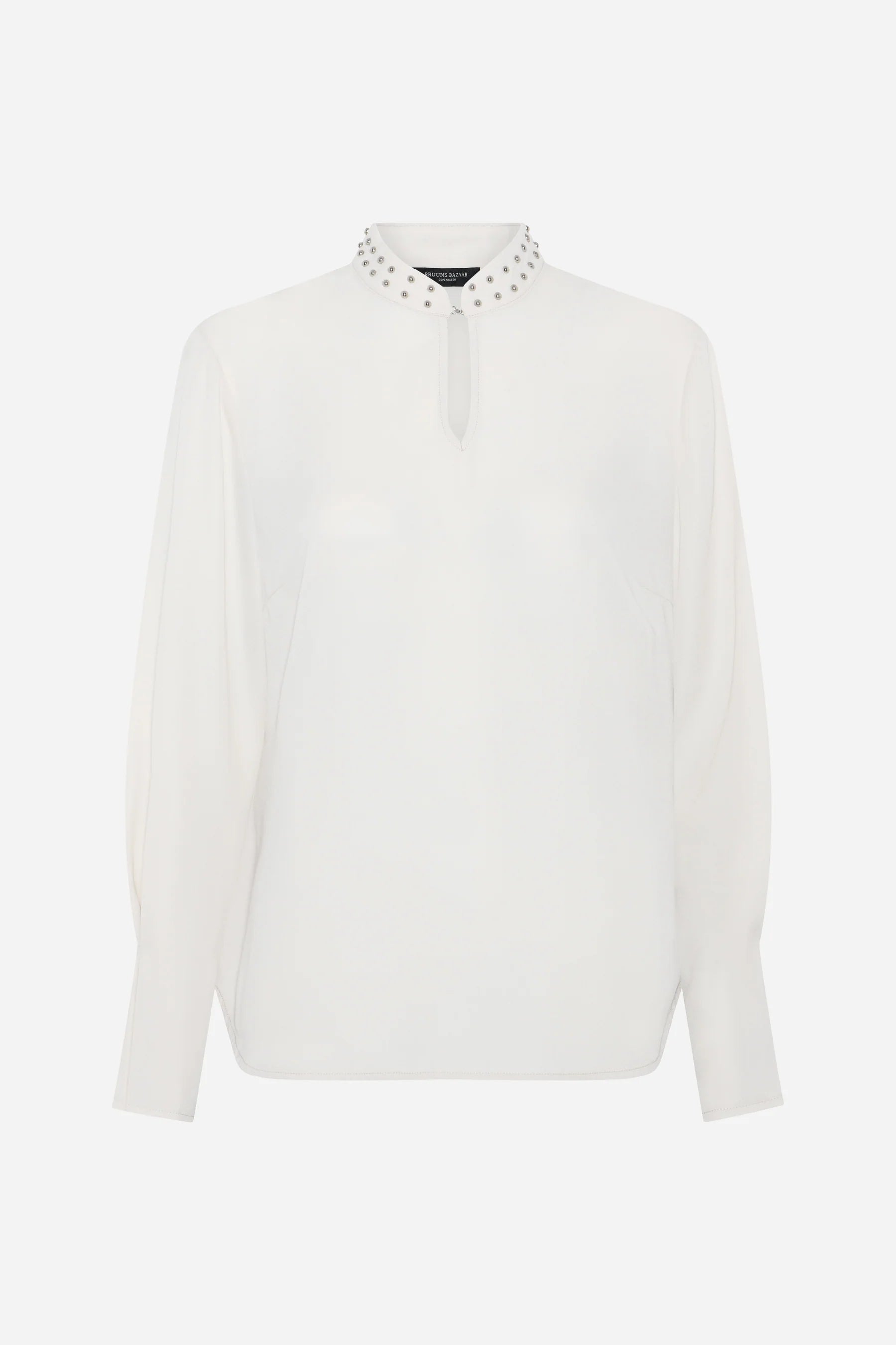 The Camilla Ananta blouse is an elegant design with a regular fit and a distinctive neckline with decorative studs. The detail adds a sophisticated twist to the minimalistic silhouette.
