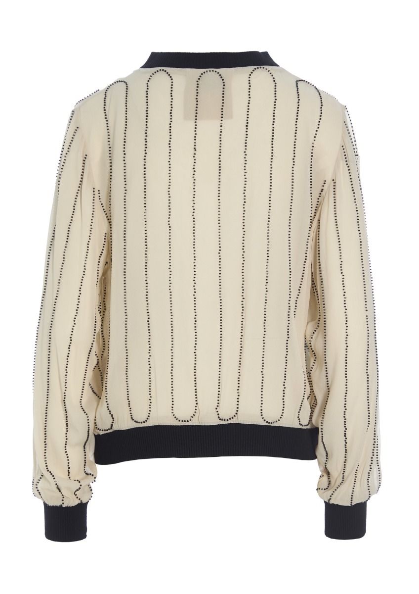 Beautiful blouse with beads that wind up and down to create an artistic effect. The blouse will upgrade a basic pair of trousers or jeans. Pair it with a skirt for an elegant outfit for a night out.