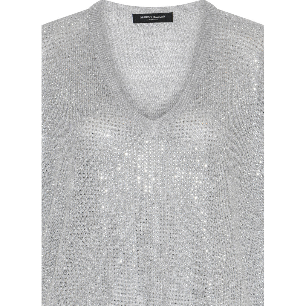 This silver knit V-neck top is finely sprinkled with subtle glitter yarn, catching the light with every movement without feeling over-the-top. The relaxed, drapey cut and short sleeves keep it effortless and comfortable, while the clean V neckline flatters and layers easily under a blazer or jacket.