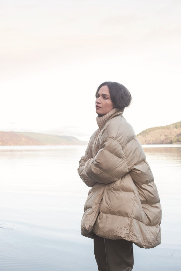 A modern take on cold-weather layering, this neutral-toned puffer jacket balances warmth with understated elegance. Designed with a softly oversized silhouette and quilted construction, it offers cozy insulation without feeling bulky. Effortless and versatile, it’s the perfect outer layer for crisp days, styled over everything from knits to tailored separates.