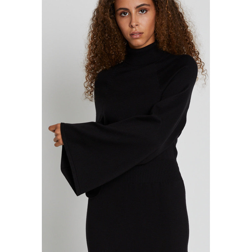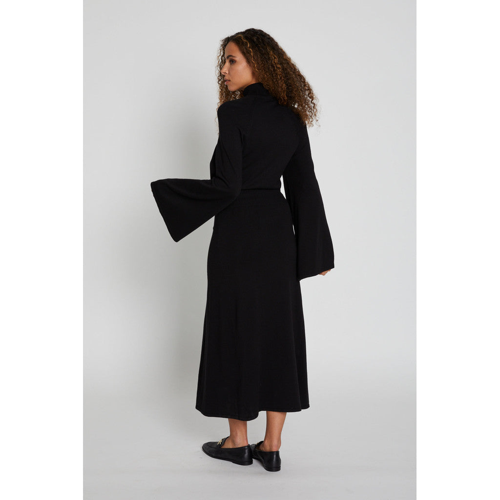 Elegant and effortlessly refined, this black knit dress features a sleek mock neck and beautifully flared sleeves for a modern, minimal silhouette. Its fitted waistline adds subtle definition, while the midi length creates a timeless, elongated look. Perfect for day-to-night dressing, it’s a chic essential that pairs seamlessly with boots, heels, or statement outerwear.