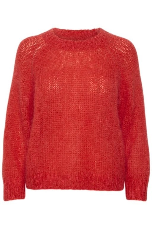 This soft, fluffy sweater comes in a vibrant red-orange that instantly brightens your whole look. The fit is relaxed with a classic crew neckline, dropped shoulders and gently ballooned sleeves finished with ribbed cuffs. Light yet cozy, it pairs just as easily with denim and joggers as it does with a slip skirt or tailored trousers for a cheerful, cold-weather outfit.